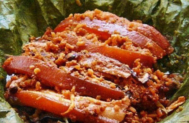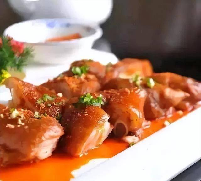 1、把黑猪脚治净,剖开纳盆后,加柱侯酱、排骨酱、芝麻酱、花生酱、盐和姜葱腌8小时,待上笼蒸熟后,取出晾凉。