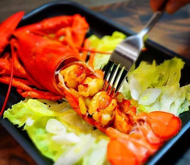 找一大盘子,用两片生菜打底,将头部和身部的壳连接好,摆好。