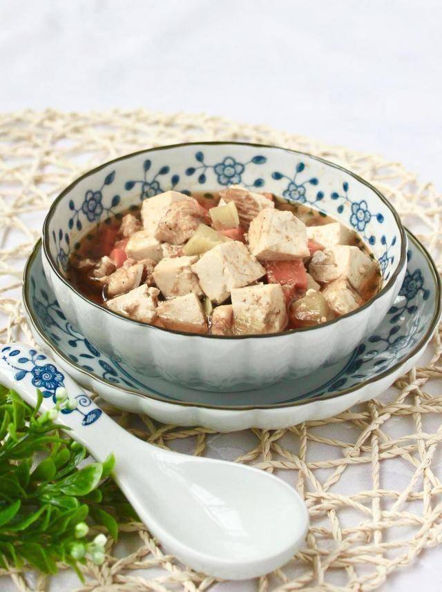 做法:1、豆腐、鸡肉、胡萝卜、莴笋切丁