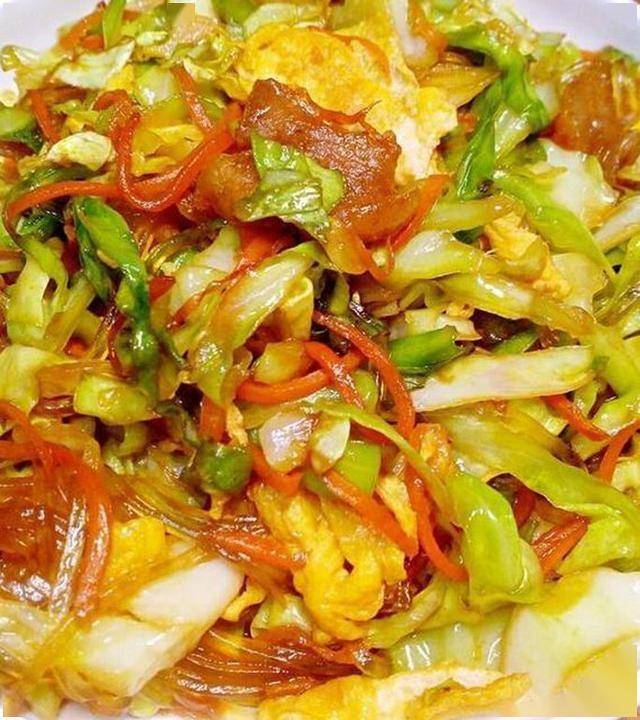 用料:粉丝一把、鸡蛋2个、包菜适量、里脊肉适量、生抽适量、胡萝卜适量、葱适量、蚝油适量;