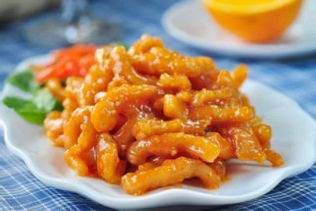 6. 倒入炸好的肉片翻炒使之挂上均匀的调汁,滴入少许明油,翻炒均匀即可。