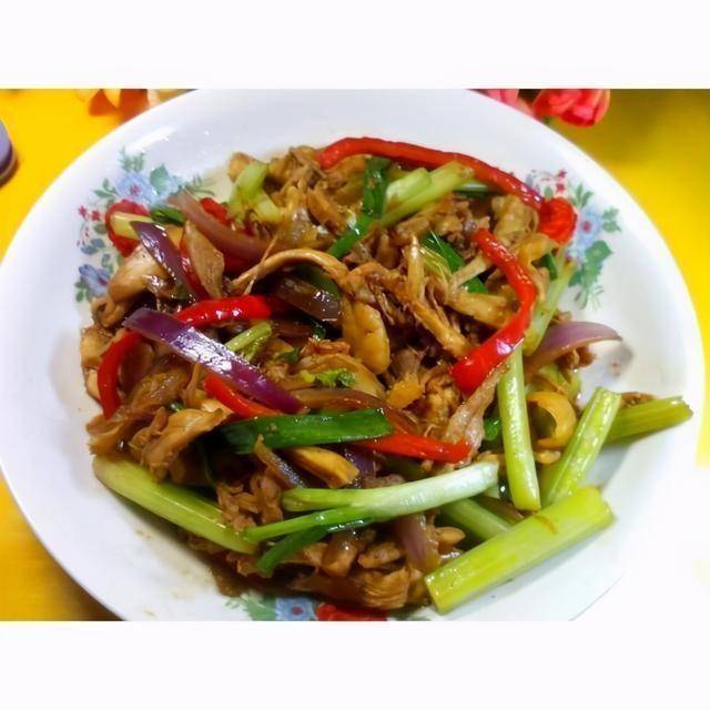 4.加入洋葱和红椒丝翻炒至软身;临出锅前再加入芹菜和香葱段;最后淋上少许香油即可出锅;