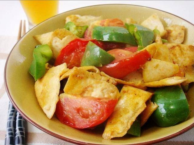 做法:1、白豆腐干洗净,切成簿片,西红柿、绿菜椒切成块。