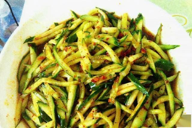 3.用削皮刀继续削,把黄瓜丝放在盘子里; 黄瓜瓤比较软,切块留用。