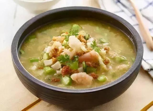 材料:虾仁50克、米饭200克、山药泥30克、金瓜泥10克、年糕30克、菜心10克。盐2克、鸡粉5克、胡椒粉2克、鸡油5克、浓鸡汤300克。