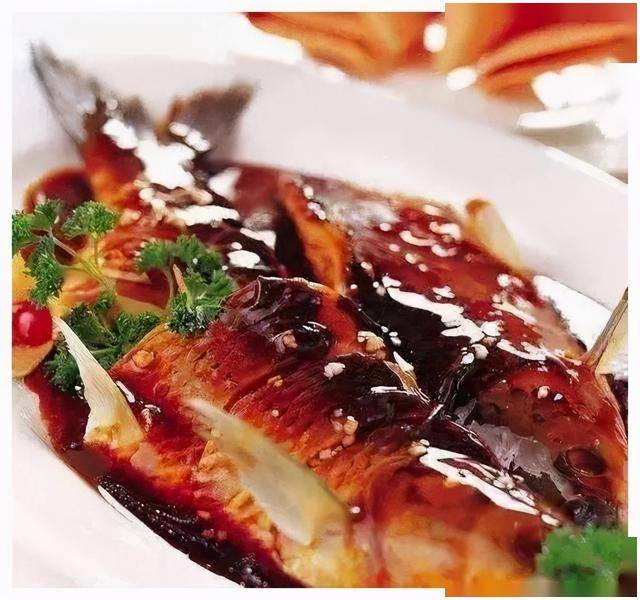 6.倒出汤汁,锅内加入少许的原汤和适量的酱油和绍酒姜末;烧开捞出鱼,码放在盘中