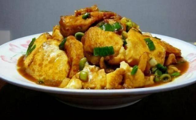 材料:豆腐、胡萝卜、洋葱、青椒、香菇、火腿、番茄酱、蚝油、盐、鸡精、黑胡椒