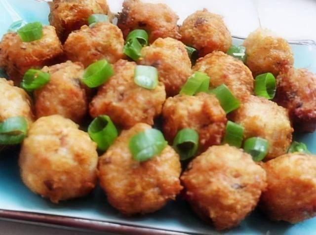 6.放进油锅的肉圆子翻炒几下.炸制金黄色就可以了