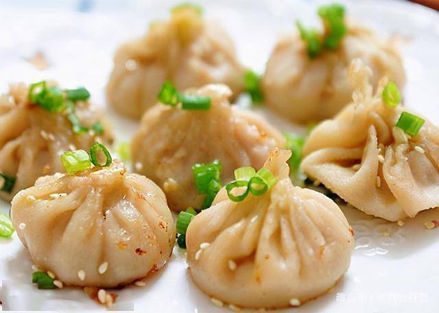 材料:饺子皮50克、猪肉(瘦)150克、植物油2汤勺、料酒1汤勺、清水3汤勺、食盐1/2汤勺、细香葱1小把、白芝麻少许。