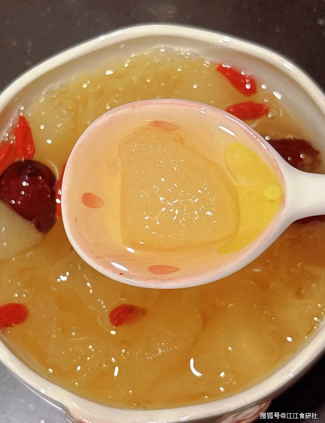 制作要领: 1.银耳要撕得碎:银耳泡发后,一定要撕成小朵,越碎越容易出胶!我第一次做时偷懒,撕得太大块,结果炖了半天都不出胶! 2.先炖银耳:银耳冷水下锅,大火煮开转小火,先炖30分钟,这样才能炖出胶质。 3.雪梨后放:银耳炖出胶后,再放雪梨块和红枣。雪梨不能炖太久,不然就烂了! 4.冰糖最后放:关火前5分钟再放冰糖和枸杞。这样甜度刚好,还能保持枸杞的完整! 炖好的银耳羹胶质满满,雪梨清甜,喝完全身都暖乎乎的!