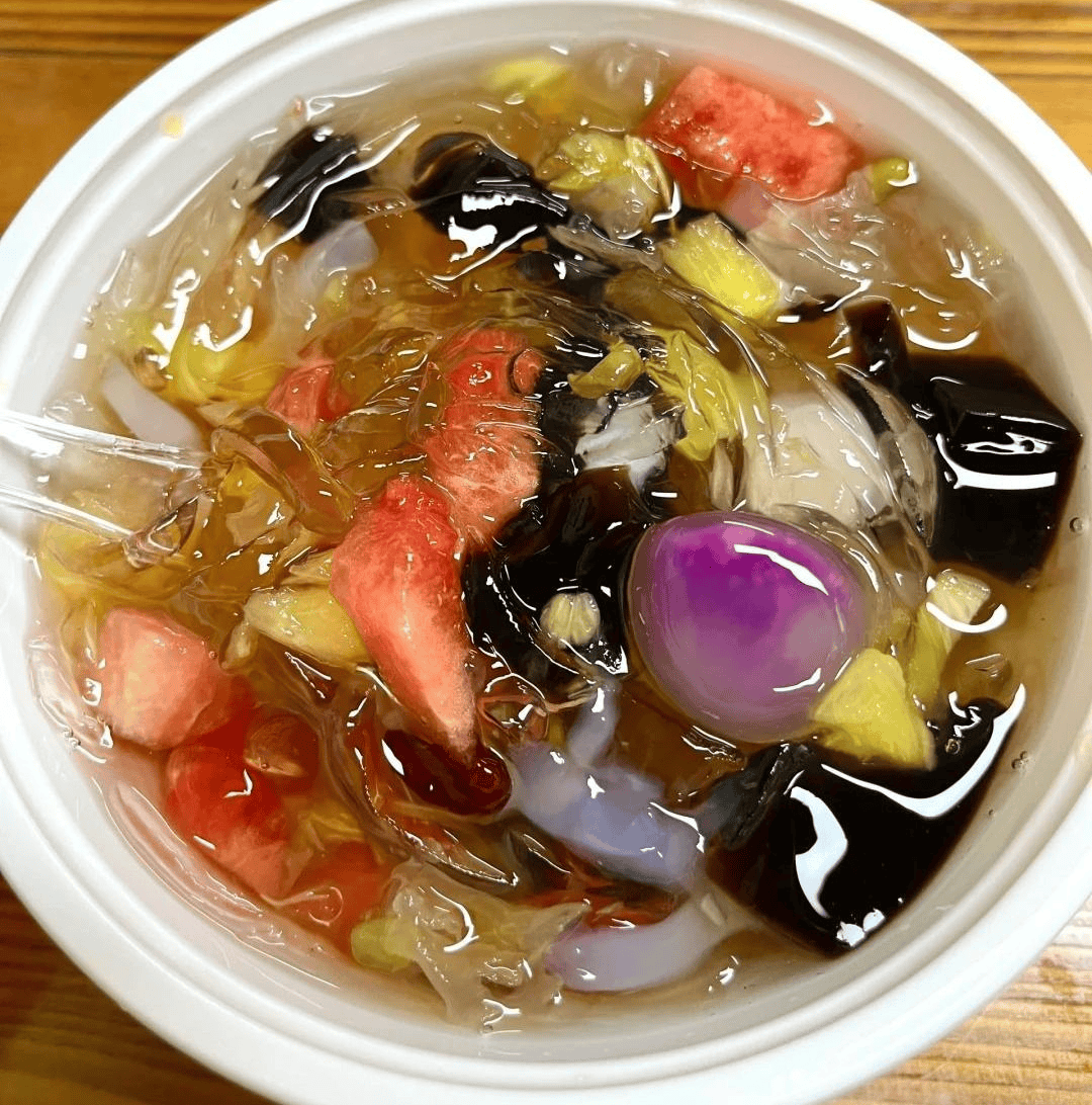 4. 四果汤: 四果汤是闽南夏天的 “降温神器”,不是固定只有四种料,是让你 “自己搭” 的快乐 —— 街边的小摊上,玻璃柜里摆着十几种料:煮得粉糯的绿豆、红豆、薏仁、花生,还有 Q 弹的阿达子、芋圆、银耳,想吃啥就用小勺子舀啥,装满一碗后,老板再浇上冰凉爽口的冰糖水,有的还会加一勺蜂蜜,甜得刚好不齁。 端着碗蹲在路边吃,吸溜一口,冰凉的糖水裹着粉糯的豆子、弹牙的阿达子,清热又解渴,比喝奶茶健康多了。闽南的夏天,不管是学生放学还是上班族下班,都爱来一碗,连老人小孩都捧着碗吃得开心,说 “夏天没四果汤,日子都过不下去”。