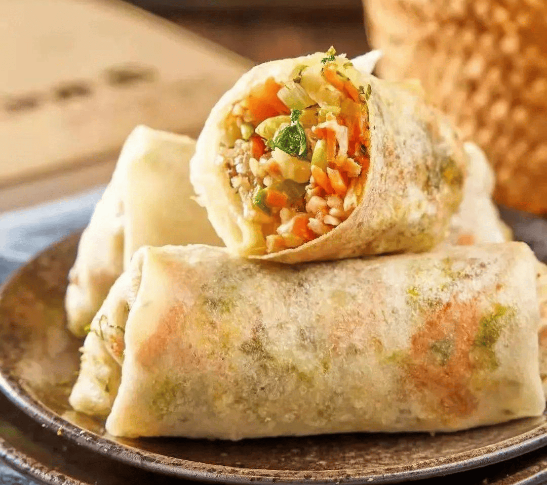 2. 闽南春卷(润饼): 闽南春卷还有个亲切的名儿叫 “润饼”,是本地人过年桌上的 “硬菜”—— 少了它,年味儿都像差了点。饼皮得擀得比纸还薄,要的就是 “裹再多料也不破”;里面的馅料特丰富:胡萝卜丝、豆干丁、肉丝得先炒得喷香,再混上脆生生的海蛎煎碎、酸甜的萝卜丝,有的人家还会加一勺花生碎提香。 卷的时候得小心,从一头裹成圆筒,有的爱放进油里炸 10 秒,外皮脆得掉渣;有的直接吃,软乎乎的。一口咬下去,能尝到肉丝的鲜、海蛎的甜、萝卜丝的脆,各种味道混在一起,鲜得让人眯眼。