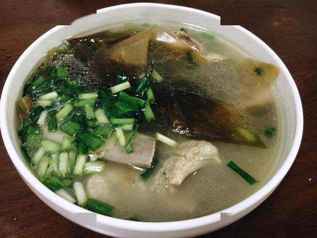 3.净锅内加入1000克清水,放入排骨、葱段、姜片、料酒,大火烧开后转中火焖煮30分钟;放入海带,再用大火滚煮10分钟,拣去姜片、葱段,加盐调味即可
