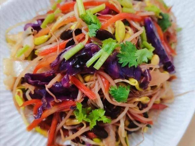 2、热锅下油爆香姜,先将包菜和萝卜丝炒软,再下黑豆芽炒香,放适量陈醋,糖,素蚝油,鲜蔬粉勾芡炒匀,装入碟放点芫茜即成。