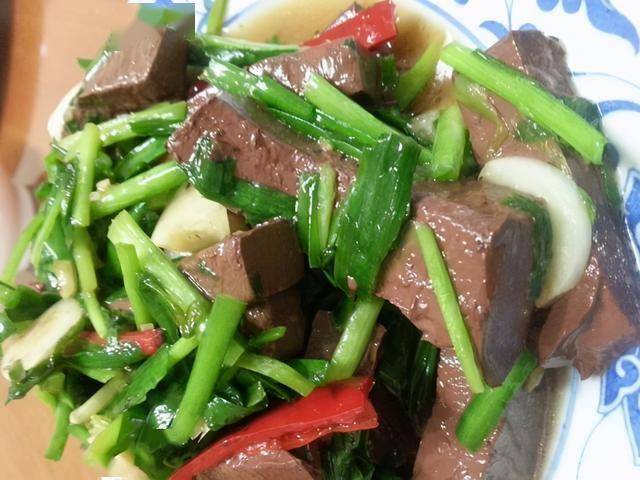 材料: 韭菜1小把、鸭血一块、红椒、蒜、盐、生抽、料酒;