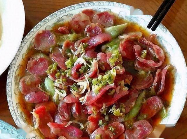 1.熟牛肉切成0.2*4厘米见方的薄片。青蒜苗择去黄叶、根须,洗净切为3厘米段;大葱、姜洗净均切成丝待用。