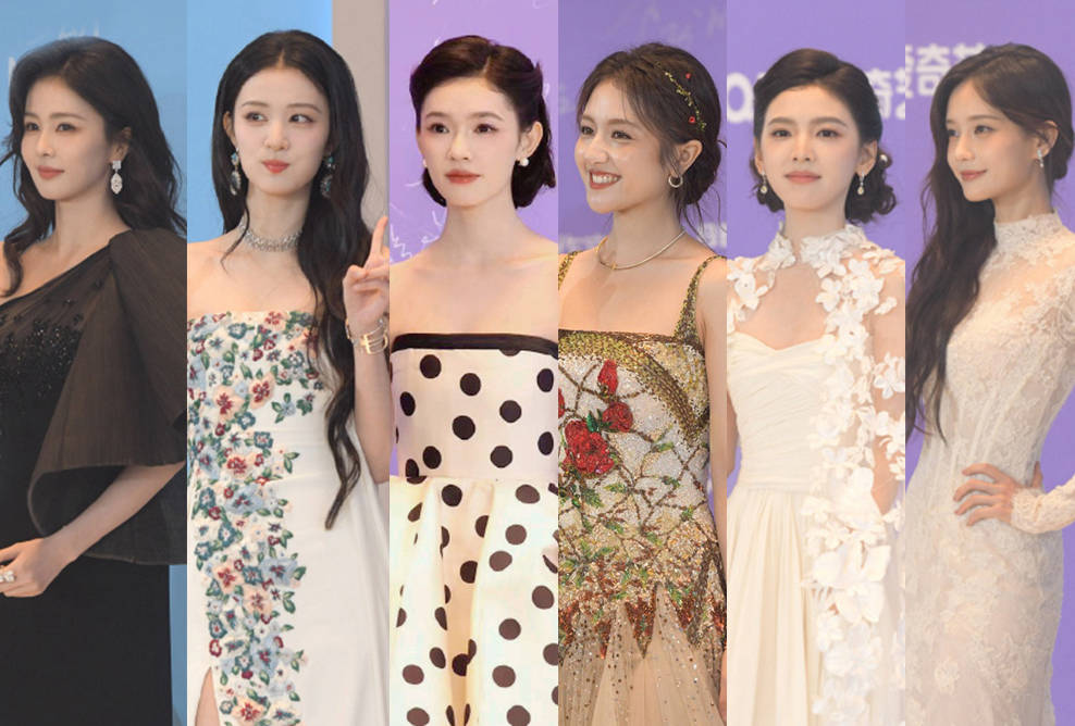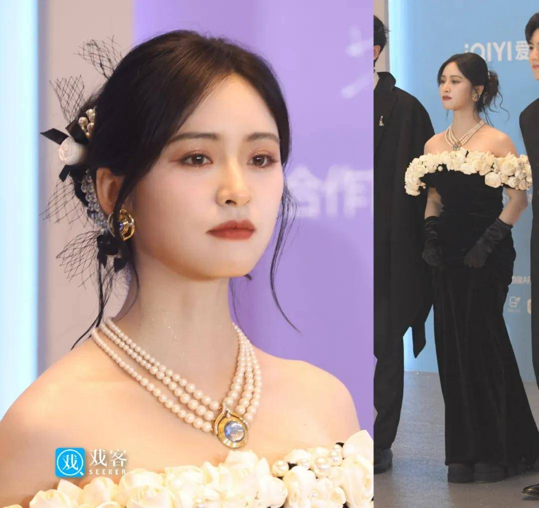 沈月一改往日的小女生风格,穿了一条缀有白花的黑色丝绒长裙,老实说比那些蓬蓬的公主裙更适合她,让人看到她除了可爱之外也有优雅大气的一面,化妆师、发型师、造型师的审美都值得一夸。