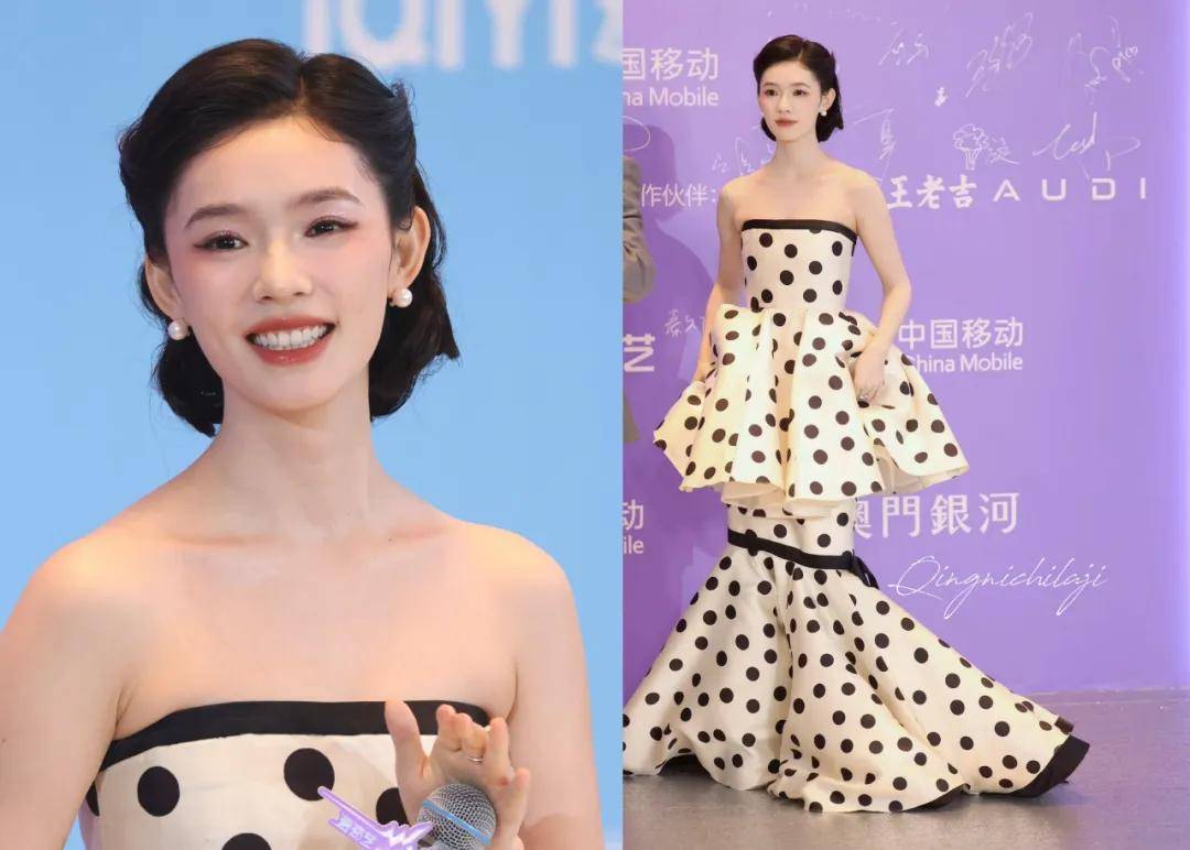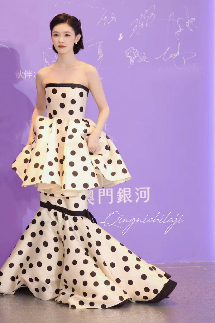 林允穿了一条波点裹胸鱼尾裙,她和团队似乎总能挑中适合她但风格不一的礼服,审美还是不错的。