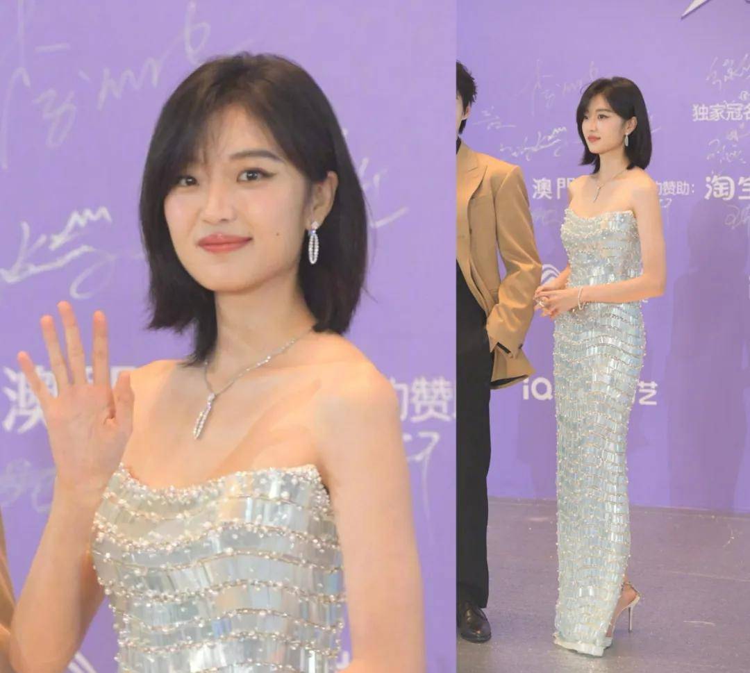 孙千穿了一条银色亮片长裙,凸显了她身材高挑纤瘦的优势。比起在古装剧里违和的样子,还是时装更适合她。