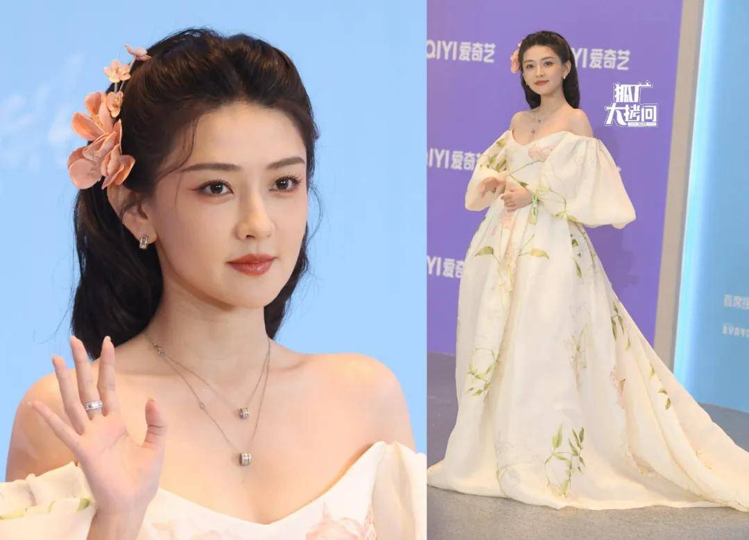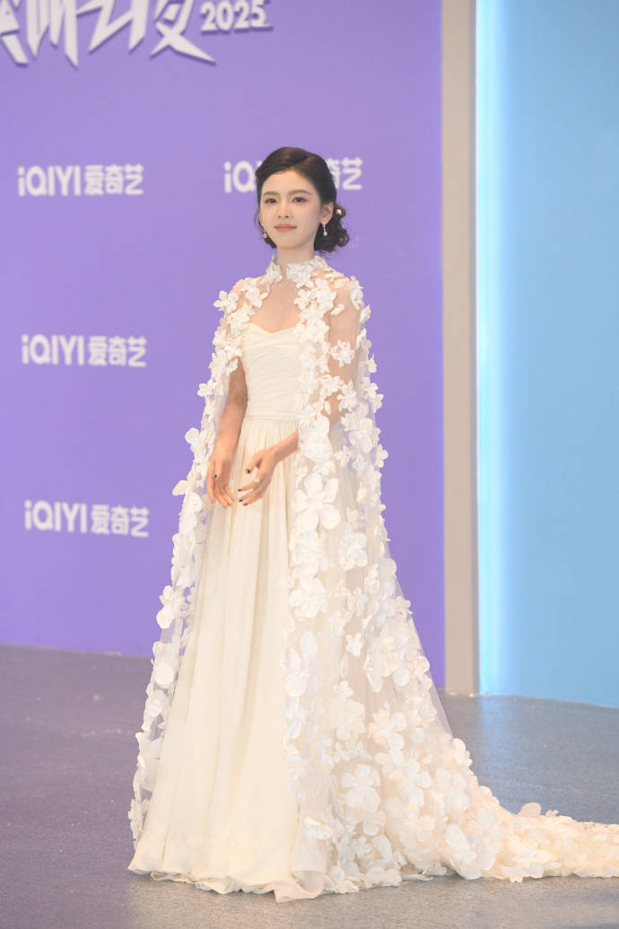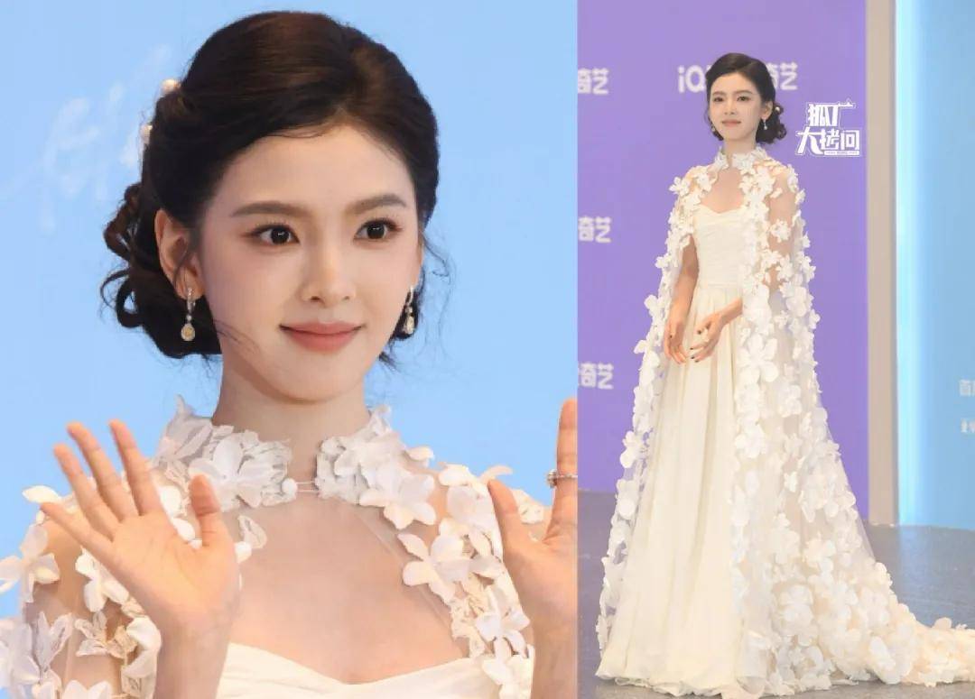 章若楠穿了一条带白色花瓣披风的白色长裙,搭配盘发显得很温柔,要是身边有一位穿黑色西服的男明星,就更像婚礼上的新娘了。