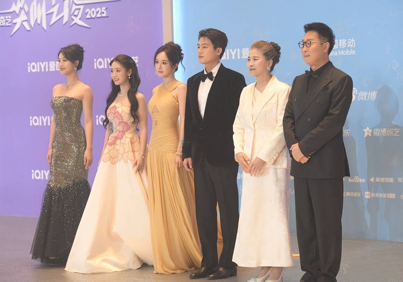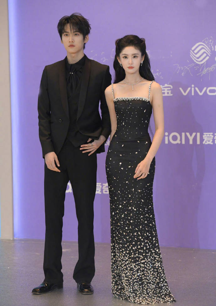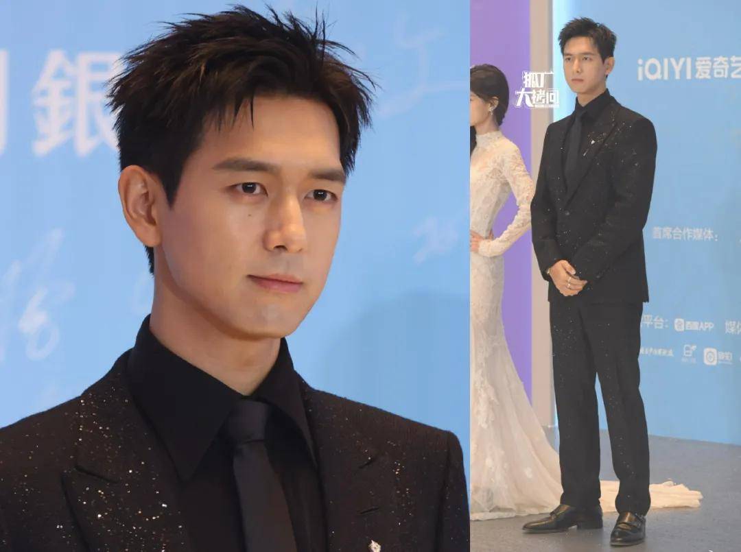 李现穿了一套全黑的西装,虽说外套是带点亮片装饰的,但着装太低调了,站在女明星旁边只会像个让人有安全感的保镖。