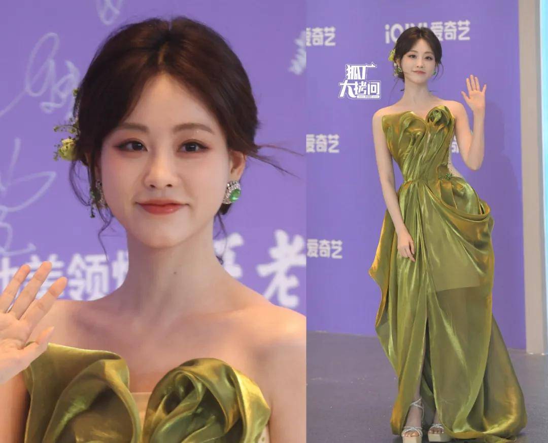 祝绪丹穿了一条绿色缎面礼服,是在她舒适区里的甜美风。