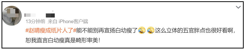 有网友夸赞赵晴非常自律,职业素养很高,努力管理身材,把最好的一面留给观众。但也有网友不赞同这样的做法,认为不应该如此宣传白幼瘦的畸形审美,赵晴本来五官就能打,胖一点也不会影响颜值,这样的纸片状态反而让人担忧其健康状况。