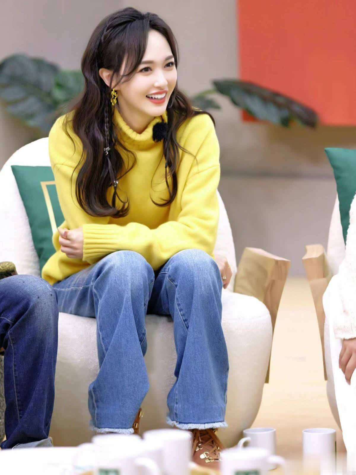 唐嫣在这套造型上很注重细节,她特意搭配了一对黄色花朵耳环,既清新又可爱,和毛衣的黄色相得益彰,整体造型显得既协调又温暖。她的发型依然保持了大波浪的元素,但在头顶做了半扎发设计,既减龄又增添了几分文艺气息。而下身搭配的蓝色牛仔裤,简约中透着活力,让整个人看起来像是校园里的大学生,充满青春气息。