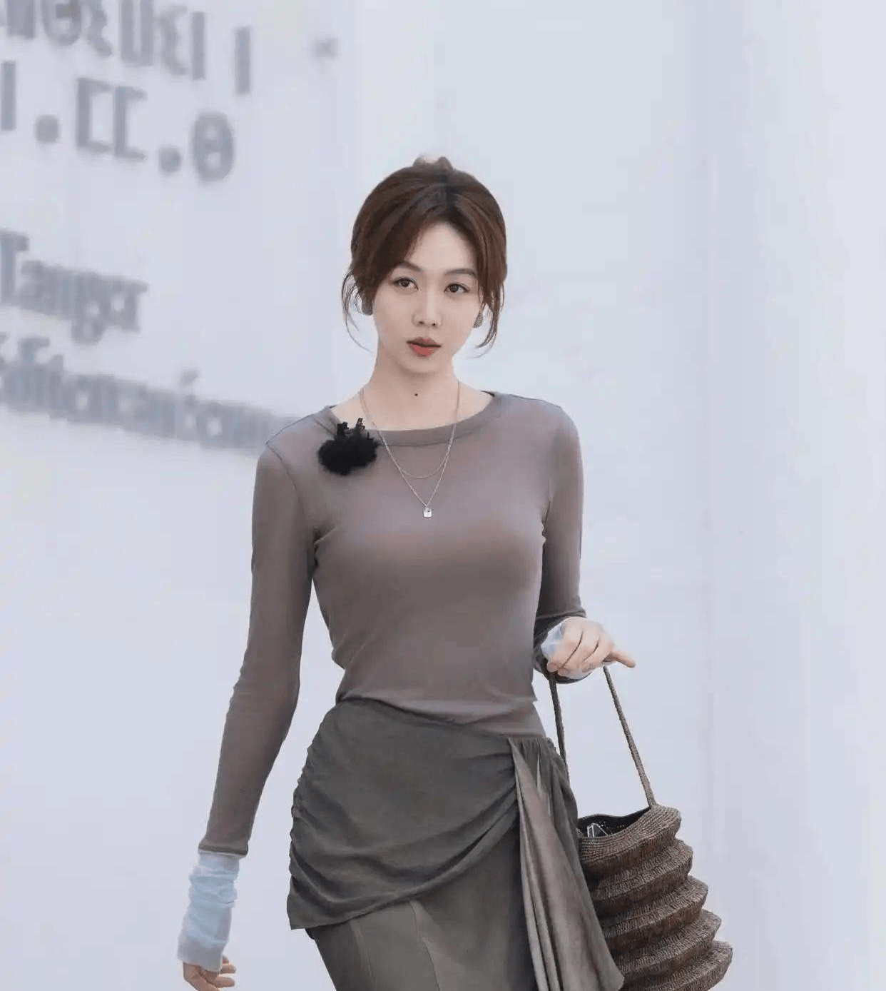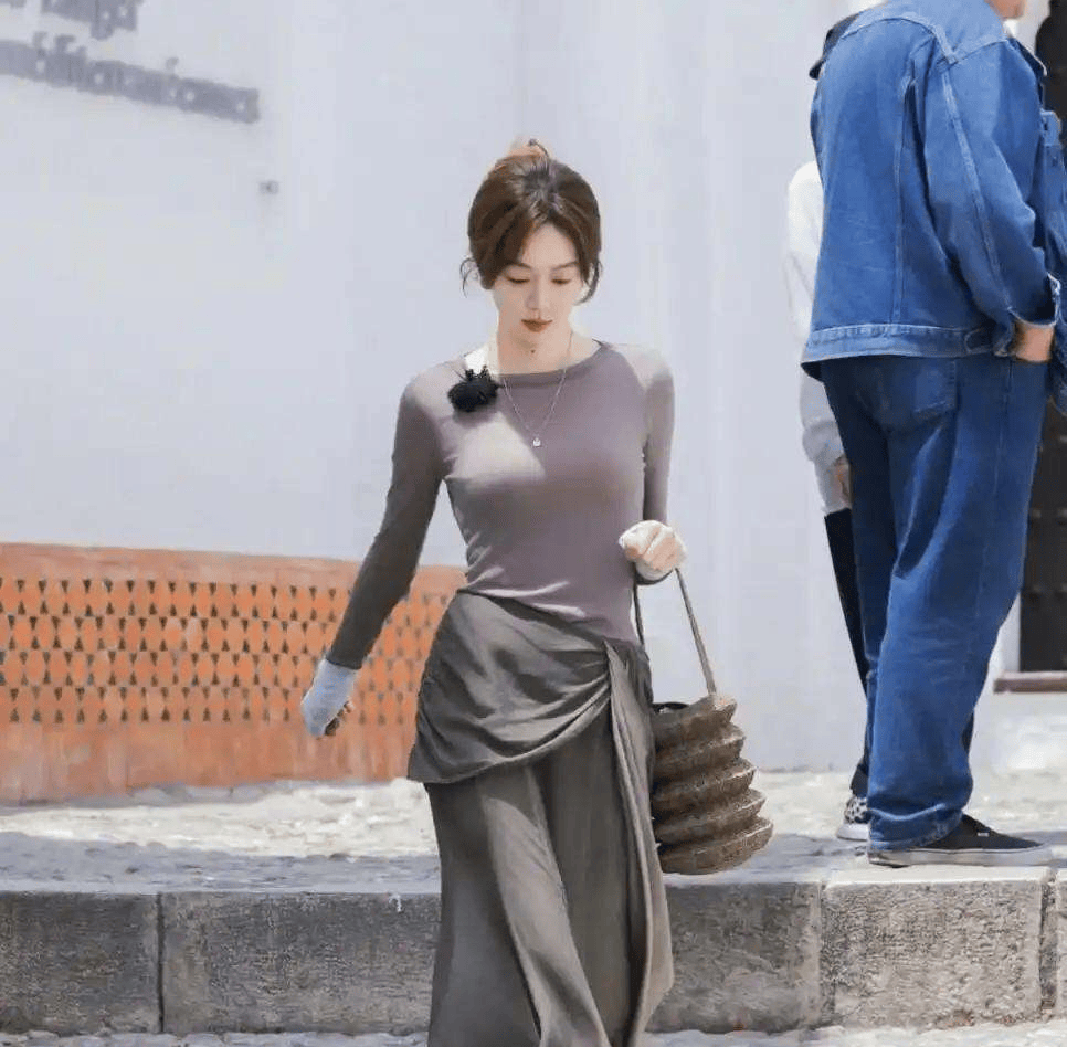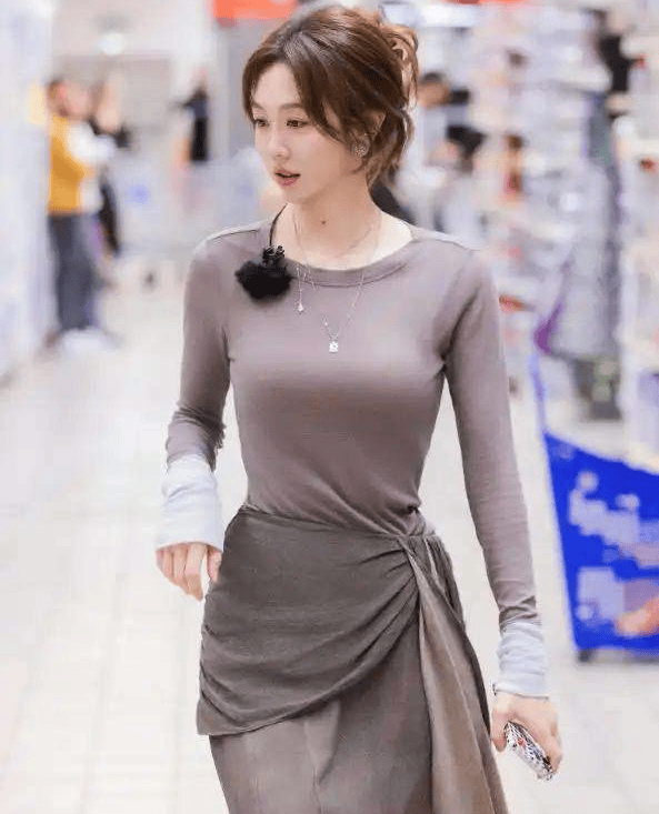 她穿的是一件灰紫色拼接的长袖紧身上衣,设计简单,没有复杂的花纹装饰,但就是这件看似朴素的衣服,完美地勾勒出她纤细平滑的腰腹线条,仿佛量身定做的那样。下身搭配的是同色系的灰色鱼尾裙,裙子的拼接设计巧妙地收紧了她的腰线,而裙摆的鱼尾造型则顺着臀部线条自然展开。每走一步,曲线美感就愈发凸显,她的身材真是让人艳羡不已!