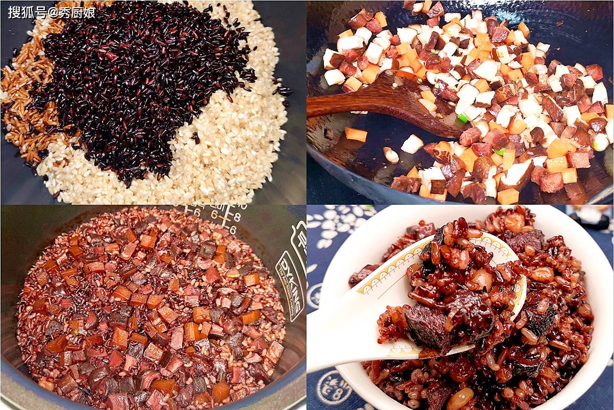 3. 倒入泡了2小时的糙米、红米、黑米混合米(比例随意),加水比平常煮饭稍多一点 4. 全部转入电饭煲,按杂粮饭模式煮熟即可 这饭最大的好处就是——省事又丰盛!香菇的鲜、胡萝卜的甜、腊肠的香,全都融进杂粮里。糙米红米黑米保留了更多维生素和矿物质,腊肠少量使用既能提味又不至于摄入过多盐分。一锅里有菜有饭,特别适合不想多折腾的时候。