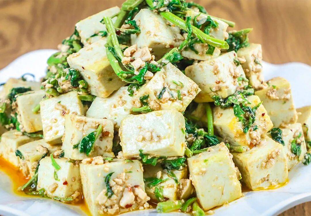 3.汆过水的豌豆面和青红椒放进一个盆里,加入蒜末、食用盐、鸡粉、糖提味,最后加入一点香油、白醋,搅拌均匀就能装盘啦,美味即成。 03 香椿芽——健胃美容 推荐做法:【香椿豆腐】 1.准备老豆腐一块,先切成厚片,再切成均匀的小块;香椿叶一把,清洗干净,把根切掉;熟鸭蛋两个,剥掉外壳放入盆中,用勺子压成鸭蛋泥备用。