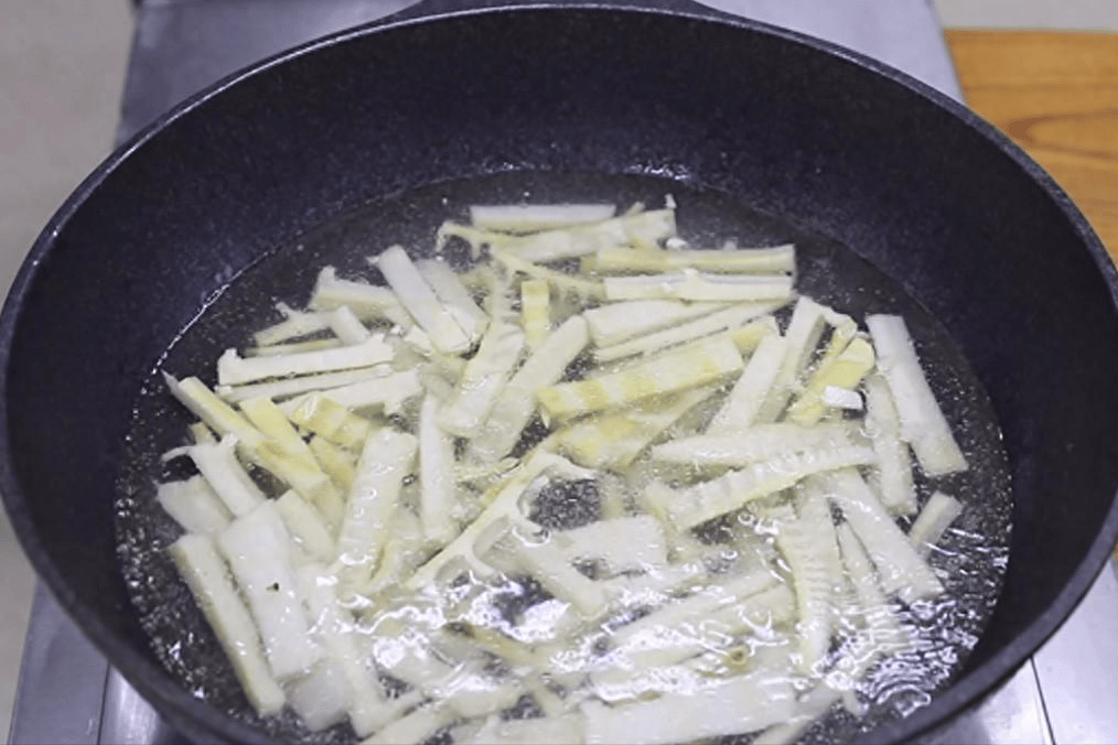 2.烧半锅开水,把春笋芽倒进去焯烫一下,既能方便炒熟还能去除苦涩味,大约10秒钟就可以了,捞出来备用,春笋芽煮得久了鲜味就流失了。