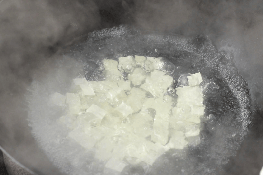 2.锅内烧水,加入少许食盐入底味,水烧开以后把豆腐放入锅中,开中小火煮2分钟,煮出豆腐的豆腥味,捞出来用清水冲洗几下,放入盘中备用。