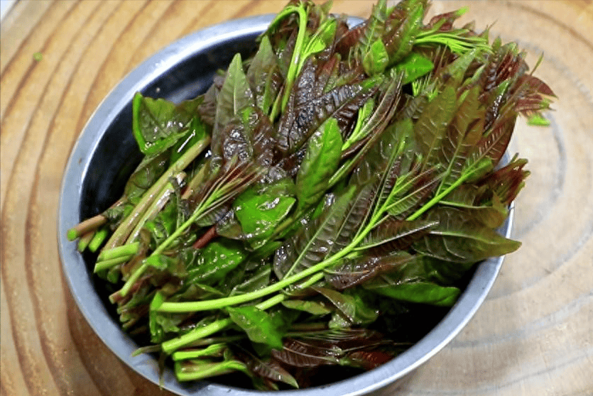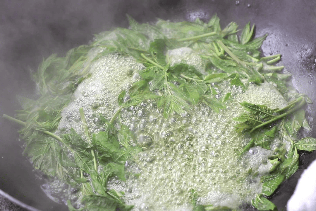3.把香椿叶放入锅中,焯水1分钟,香椿叶变成翠绿色时捞出,用清水冲洗,冷却控水,焯水主要是为了去除香椿中的亚硝酸盐,食用时更放心,攥干香椿叶中的水分,切碎备用。