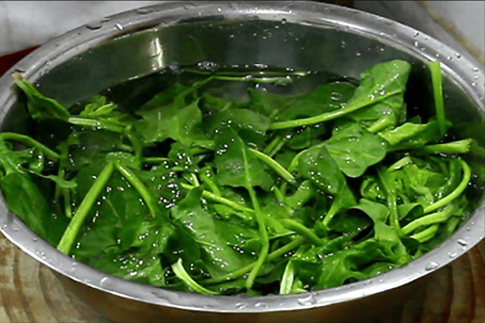 2.锅内烧水,加入一勺食盐,少许植物油,食盐和植物油能使菜品更加翠绿鲜亮,水开以后倒入绿豆芽和菠菜,快速焯水30秒钟去除菠菜的草酸,菠菜和绿豆芽断生以后立即倒出来,用凉水冲洗几下,沥干水分备用。