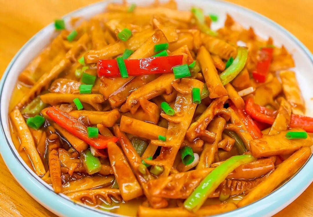 3.锅内烧油,放入葱姜蒜片爆香,倒入春笋芽大火翻炒均匀,加入适量的食盐、味精、鸡粉,蚝油,淋入适量的老抽上色,再加入生抽,中小火慢慢地烧,把水分烧开,放入青红椒丝继续翻炒几下,淋入一些水淀粉,让料汁均匀包裹在春笋上面就能出锅了,美味即成。