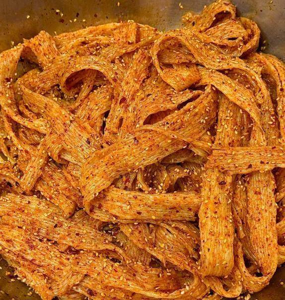 第3种:辣条 辣条是很多80、90后的童年回忆,也是现在孩子们的挚爱。包装上印着大鱼大肉,吃起来有嚼劲,很多人以为是风干的肉制品。其实,辣条的学名是“调味面制品”。主要原料就是面粉、水和植物油。