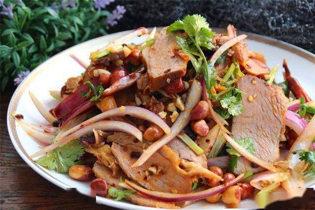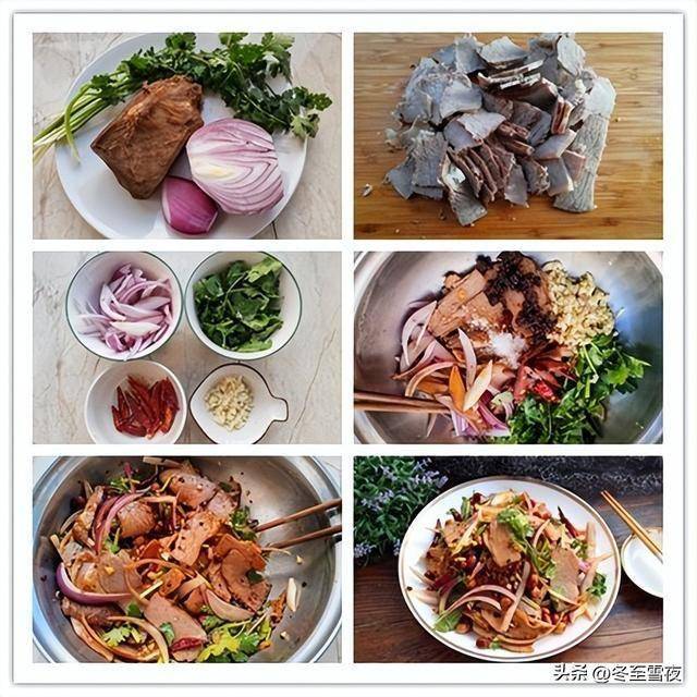 三:【凉拌牛肉】所需材料:熟牛肉1块、洋葱半个、香菜1棵、干辣椒7-8个、大蒜3瓣、油炸花生米半碗、油盐适量、香油1汤匙、白糖1汤匙、米醋2汤匙、味精少许、 做法步骤: 1.准备好所需材料,牛肉用的是熟牛肉,用酱牛肉都可以,把香菜洗净。 2.把熟牛肉顶刀切成薄片。 3.把洋葱切成丝,香菜切段,大蒜切末,干辣椒用剪刀剪成段,放在碗内待用。