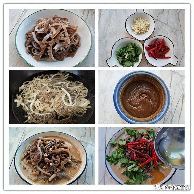 【凉拌牛百叶】所需材料:牛百叶1斤、香菜1棵、芝麻酱2汤匙、油、盐适量、香油1汤匙、干辣椒6-7个、大蒜4瓣、生抽1汤匙、白糖半汤匙、料酒1汤匙、味精少许、 做法步骤: 1.把百叶洗净后切成丝,再投洗2遍,把百叶洗净。 2.香菜切成小段,大蒜切成末,干辣椒用剪刀剪成段。 3.放芝麻酱的碗内,加入香油,用筷子搅动,再加入2汤匙凉白开,把香油搅至变稀,再加入少许盐,生抽,白糖,搅匀,芝麻酱就调好了。