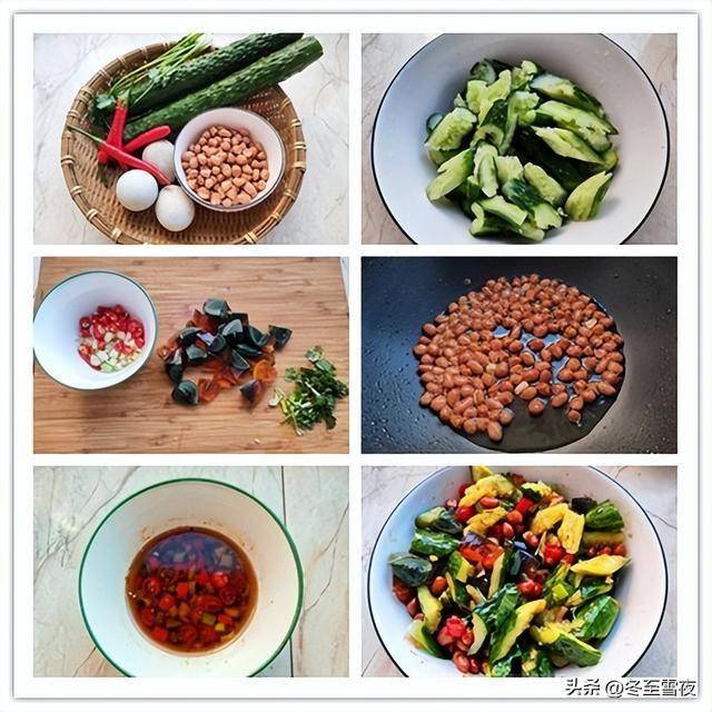 四:【皮蛋拌黄瓜】所需材料:黄瓜2根、松花蛋3个、花生米半碗、香菜1棵、小米辣3-4个、油盐适量、大蒜3瓣、海鲜酱油1汤匙、香醋或者陈醋2汤匙、白糖半汤匙、 做法步骤: 1.准备好所需材料,黄瓜和香菜洗净。 2.把黄瓜放在菜板上,用刀背把黄瓜拍裂,用刀在黄瓜中间划一刀,再把黄瓜斜刀切成段,把切好的黄瓜放在大碗内待用。 3.把松花蛋剥去外皮,冲洗一下,再把菜刀蘸点水,把松花蛋切成块,香菜切小段,葱切葱花,大蒜切末,小米辣切成辣椒圈,把葱花和蒜末,辣椒圈放在碗内待用。