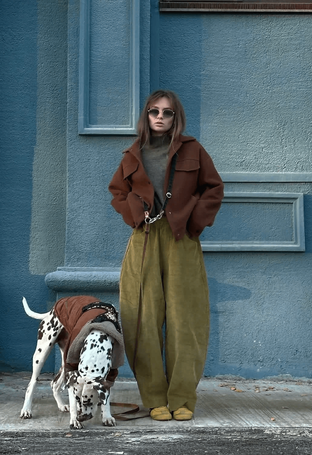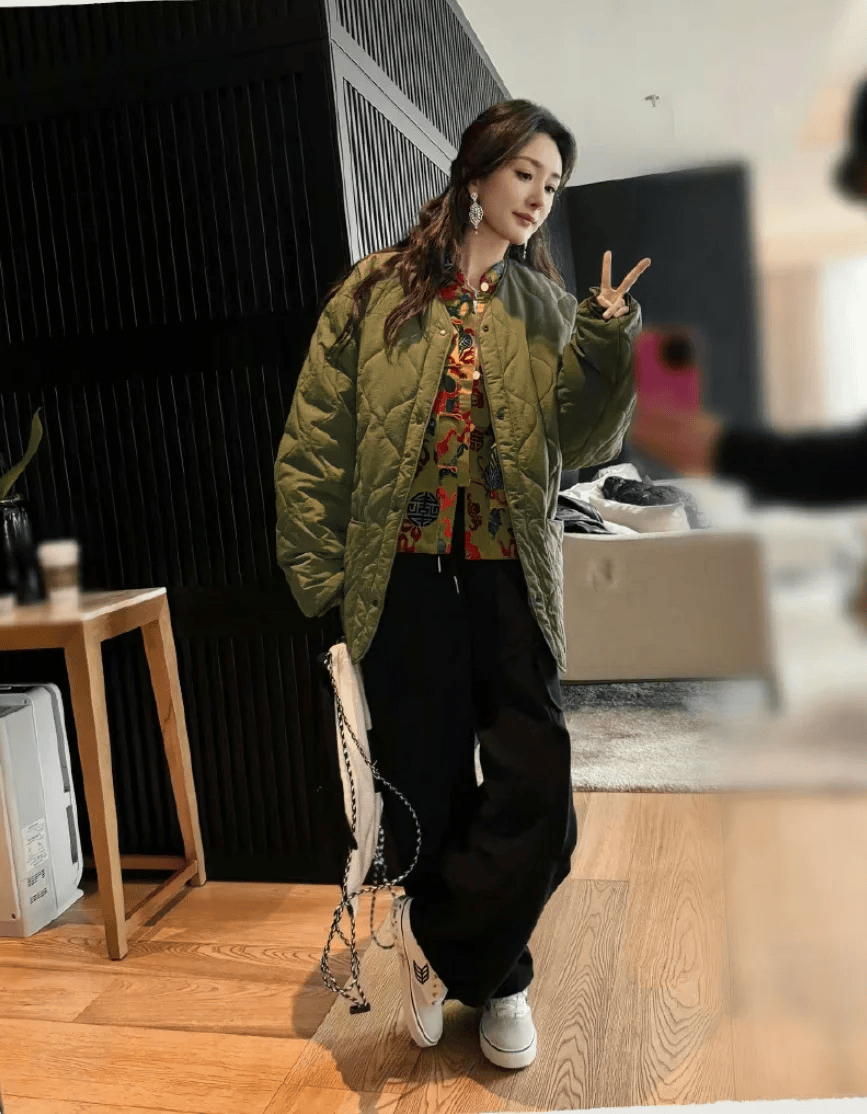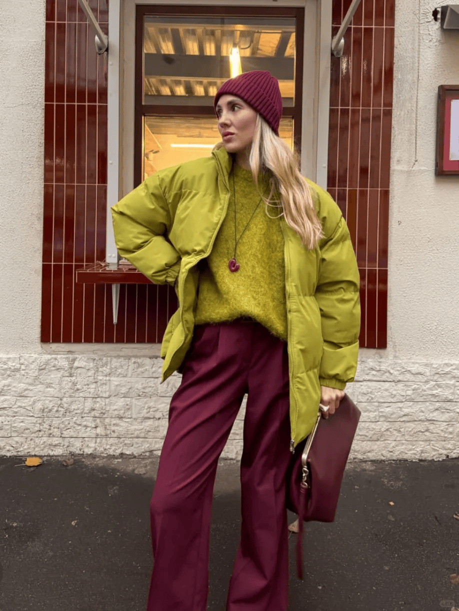 辣椒绿夹克、羽绒服搭配卡其色阔腿裤、蓝色牛仔裤,能自带焦点,美得张扬又高级,以独特的色彩张力打破路人感。
