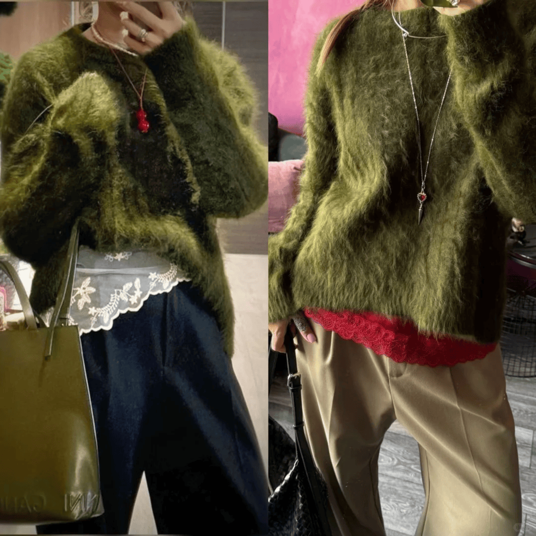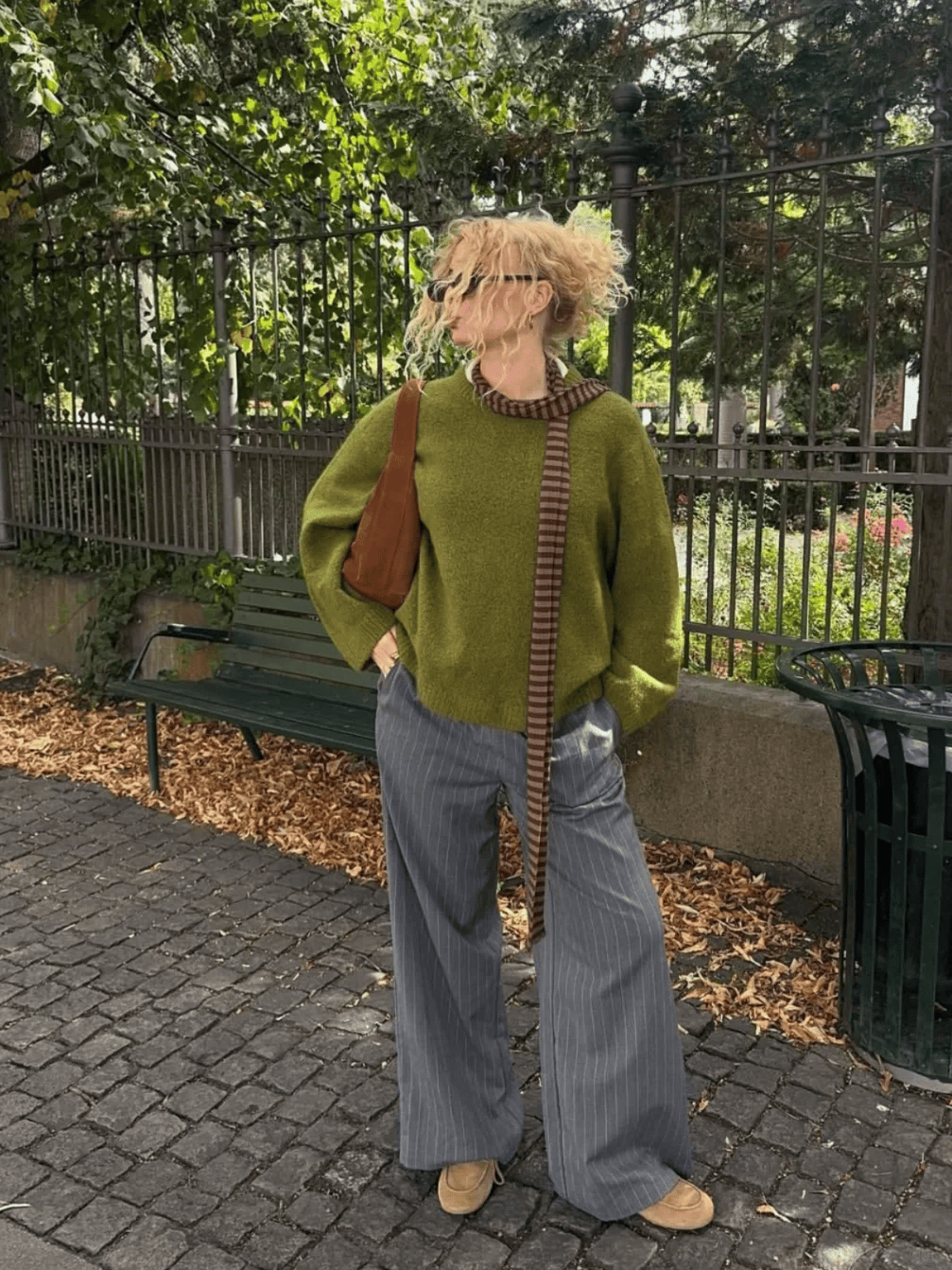 绿色和灰色真的很搭,绿色毛衣作为核心单品,搭配灰色阔腿裤,垂坠版型修饰腿型,松弛感拉满,走路自带气场;换成灰色半裙则多了几分知性柔美。