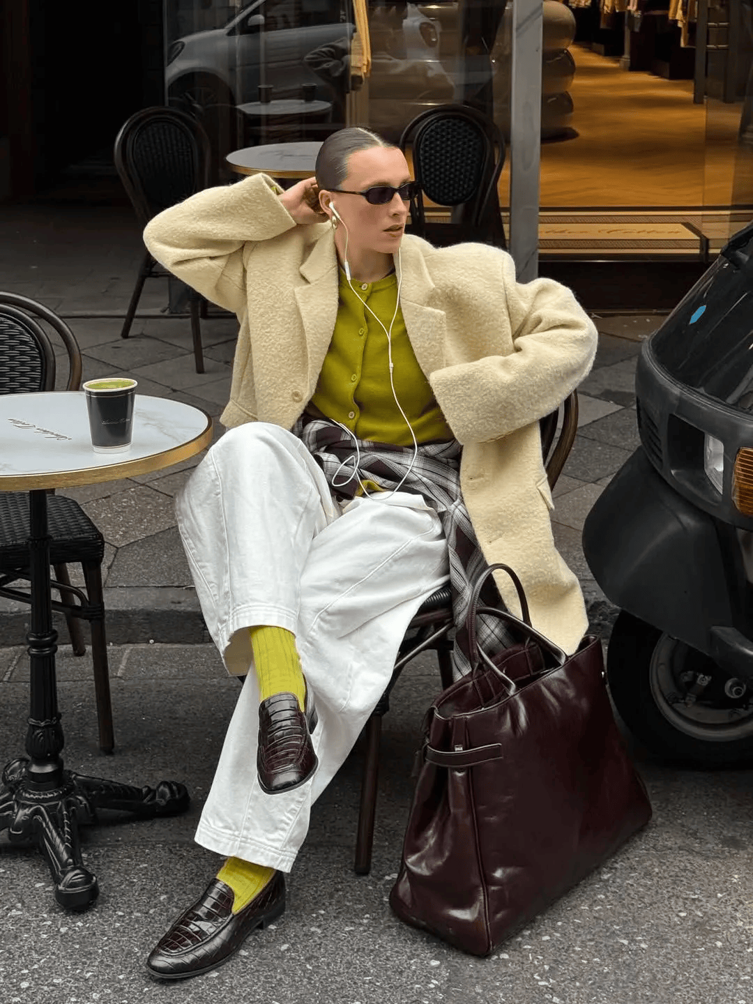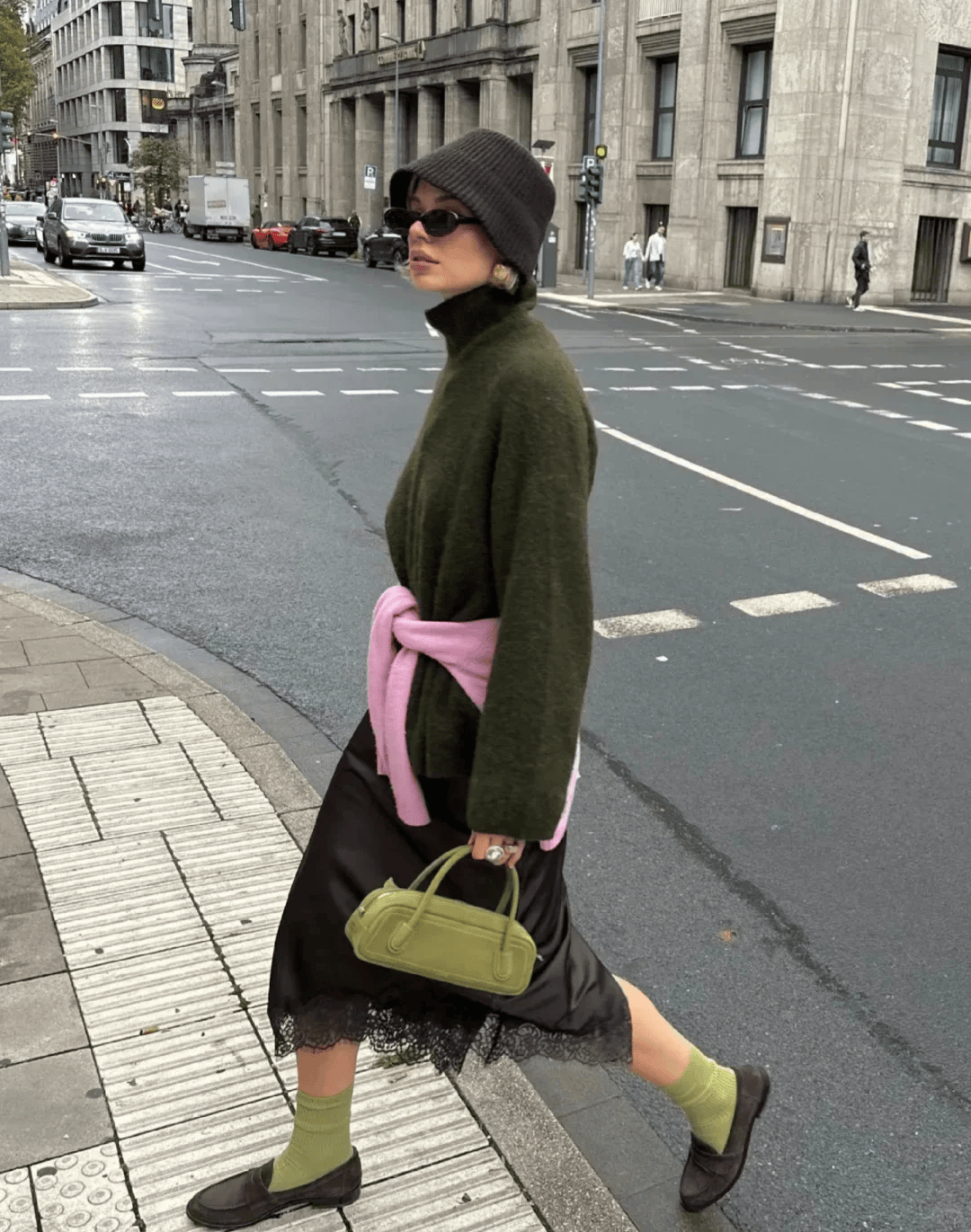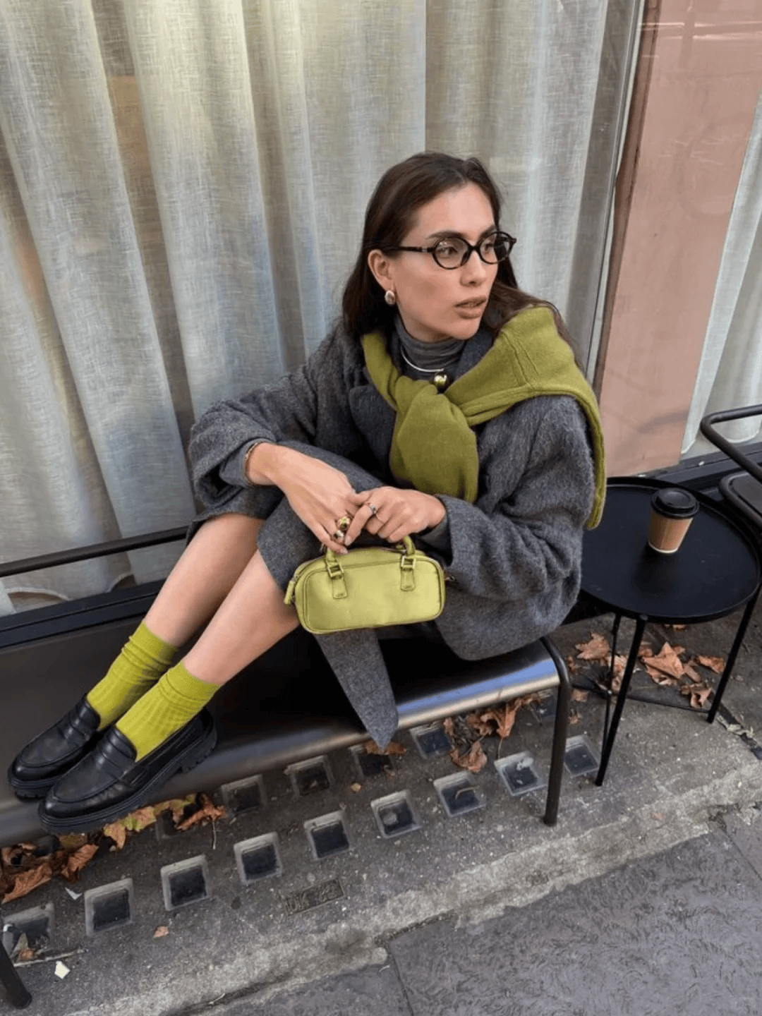 辣椒绿毛衣百搭又吸睛,配一条白色阔腿裤,更加突显绿色的鲜活打破沉闷,配辣椒绿袜子呼应起来,衬得肤色更通透,通勤路上自带气场。