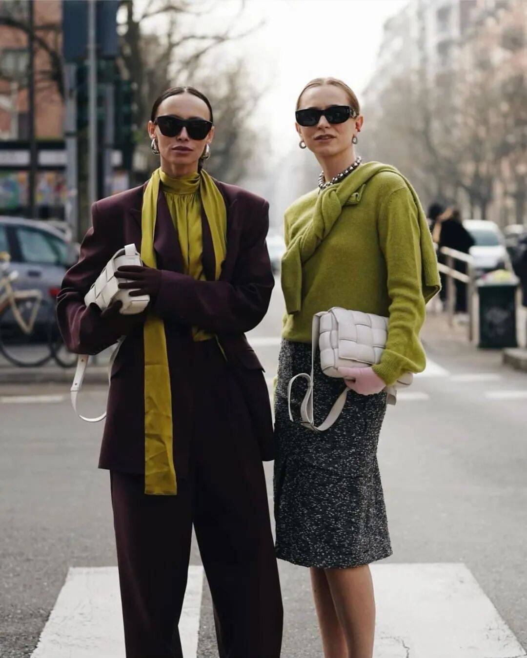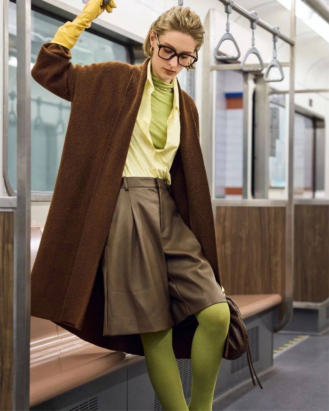 可遵循 “二八法则” ,让其中一种色彩作为主导(约占80%),另一种作为点睛之笔(约占20%)。例如,一身深棕色套装外披一件辣椒绿披肩,棕色短外套搭配绿色毛衣和阔腿裤,辣椒绿大衣搭配全身咖色内搭与配饰。