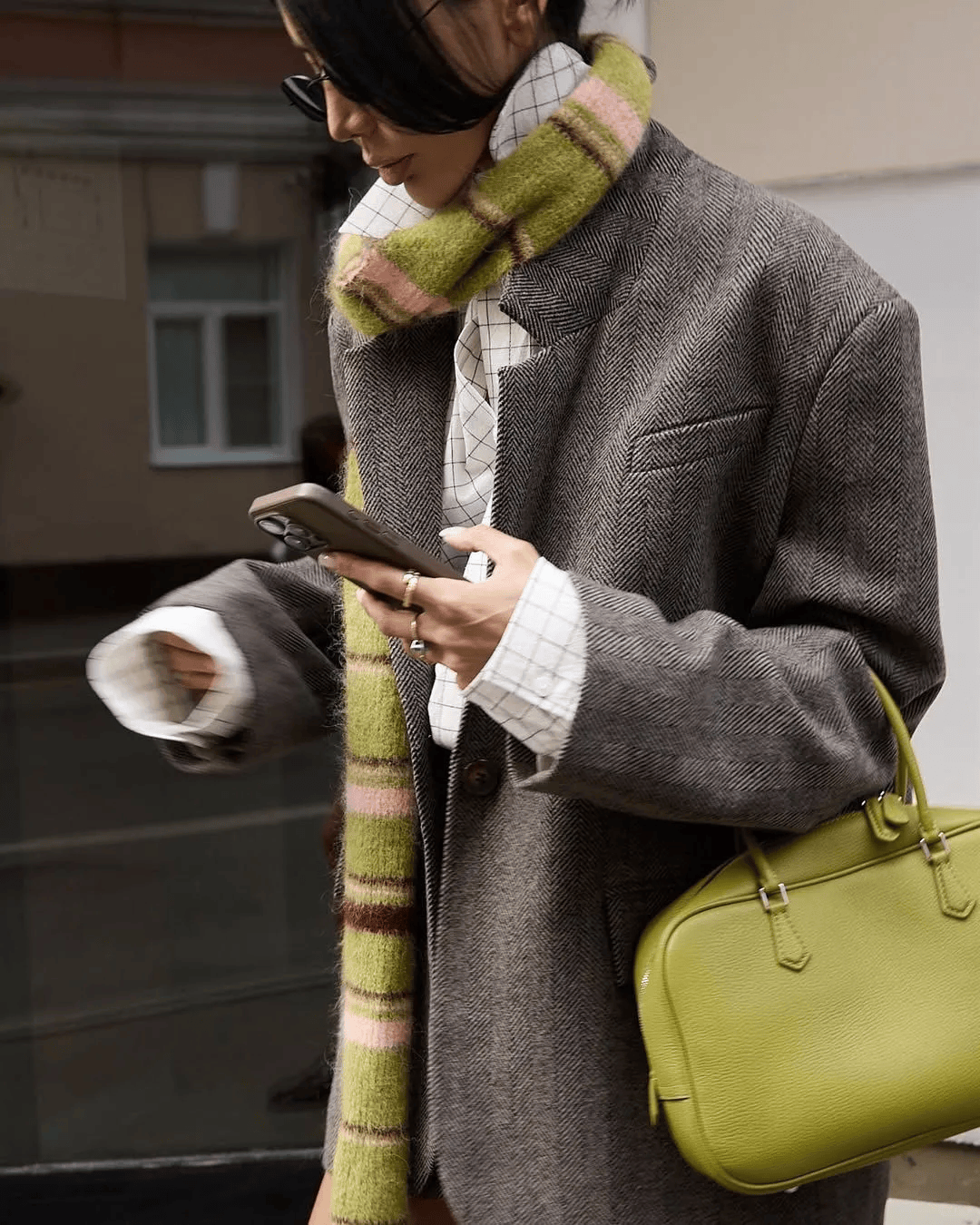 可以从小件辣椒绿单品入手,更容易驾驭,推荐辣椒绿包包、围巾、披肩、袜子、帽子,选择其中2~3件单品组合搭配,尤其是穿高级灰大衣时。