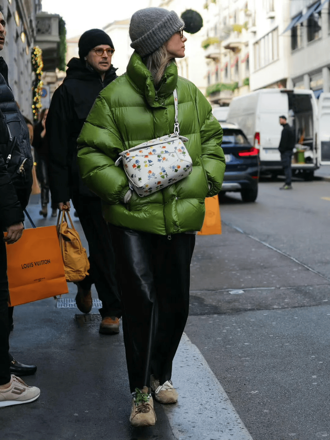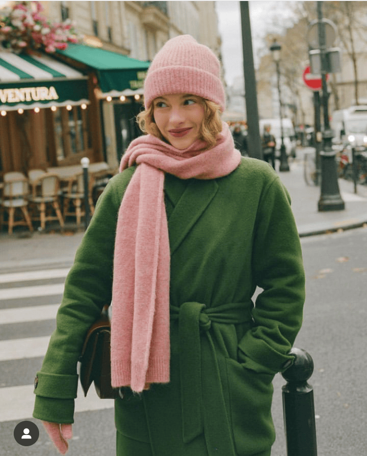 或是给绿色棉服配粉色小件单品点缀,如一顶毛线帽、一条围巾或一个斜挎包。绿与粉的碰撞充满生机与少女感,瞬间让造型变得俏皮出众。同样的,穿绿色大衣时,也可以配粉色单品撞色。