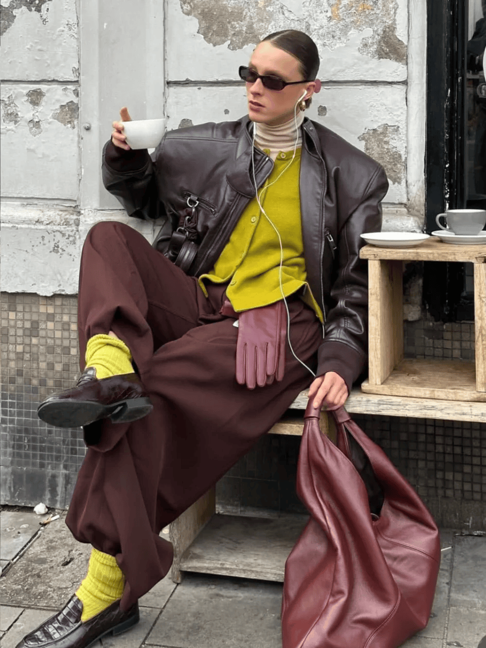 绿色毛衣、绿色夹克搭配深咖色真丝半裙,醇厚的咖色调宛如大地,稳稳承接住上半身的盎然绿意。彩色配件点缀,这一点明艳的“破局”,瞬间激活全身。