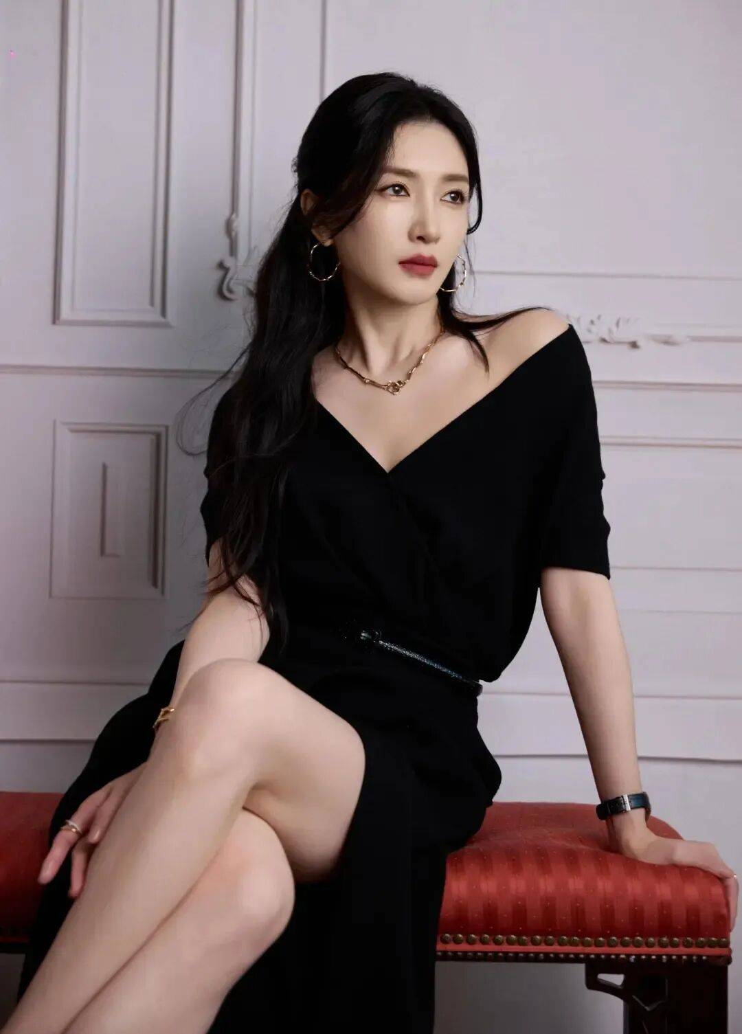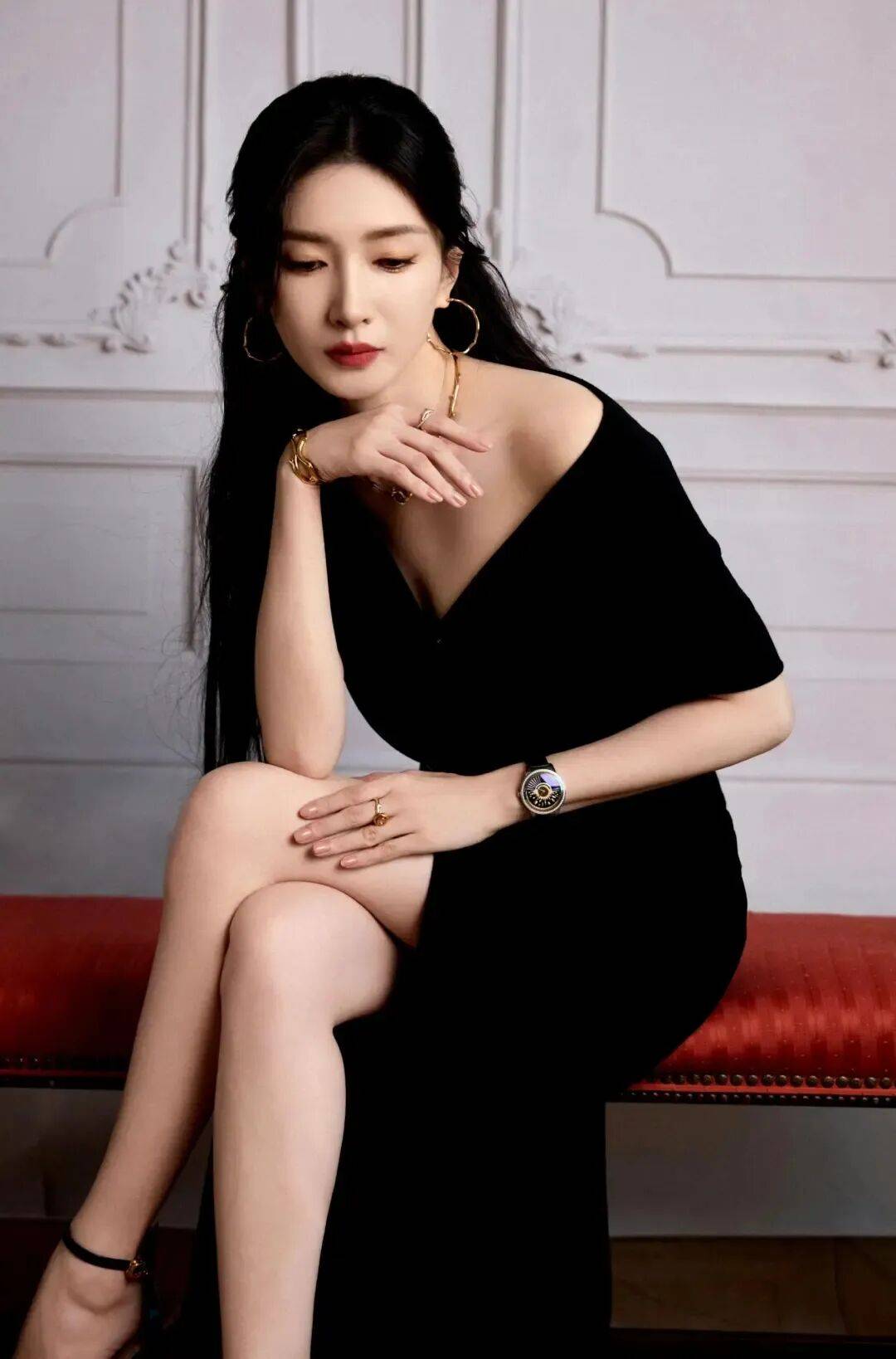 江疏影穿着一袭黑色纱裙,她俏脸端庄秀丽,五官精致,长发飘逸,这位美女坐在沙发上,露出左边的斜肩和傲人的事业线,翘起自己的大美腿,更是性感撩人!