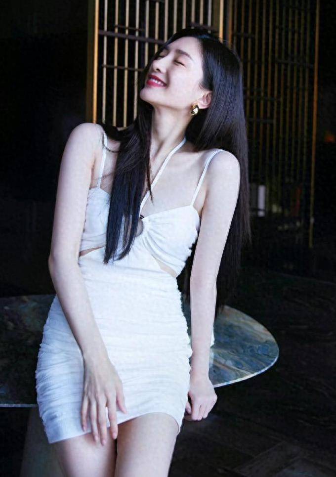 江疏影穿着白色抹胸短裙,她坐在椅子上,露出自己的白皙的香肩和大美腿,绝对性感撩人!