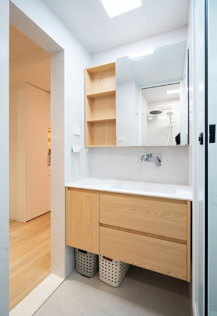 卫生间干湿两分离设计,日常使用更舒适。白色洗脸盆搭配原木色浴室柜,干净又自然。镜柜边上还搭配了一个原木展示柜,这样可以保持台面上的整洁。 主卧